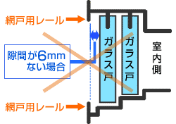 室外側のガラス戸サッシから網戸レールまでの隙間が6mmより小さい場合や上下のレール位置が異なる